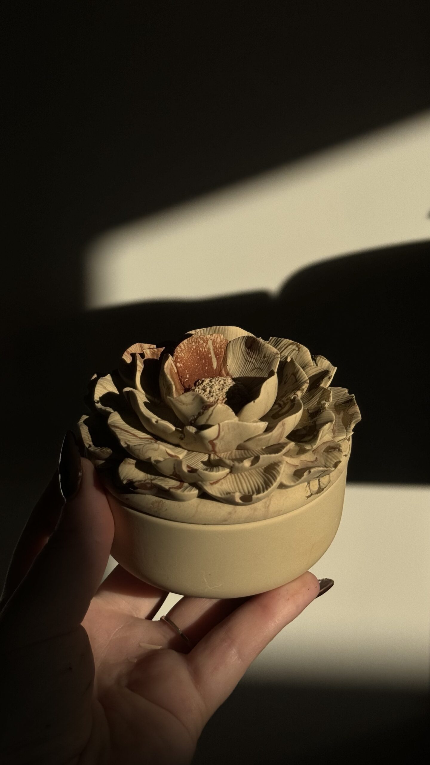 Je réalise moi-même tout mes contenants en jesmonite avec des pigments naturels provenant de carrières françaises notamment une qui se situe dans les Ardennes.