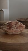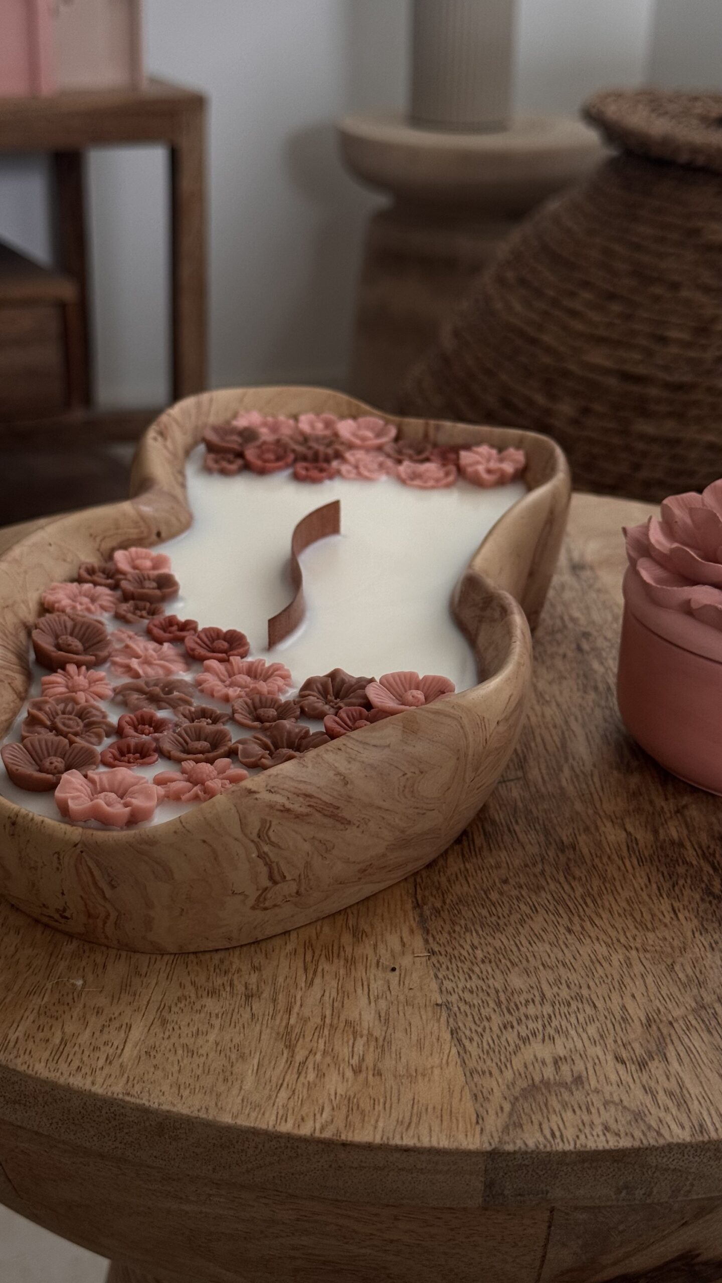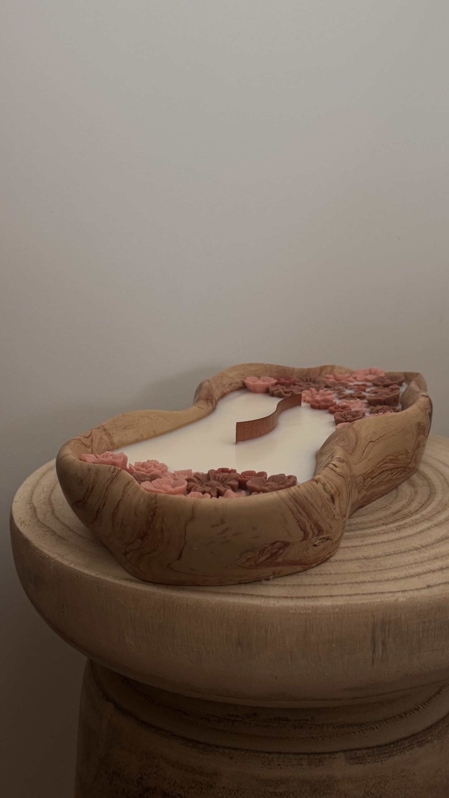 Coulée à la main dans un contenant organique en jesmonite, travaillé avec des nuances douces rappelant les nervures du bois, cette bougie est un véritable objet de décoration.
