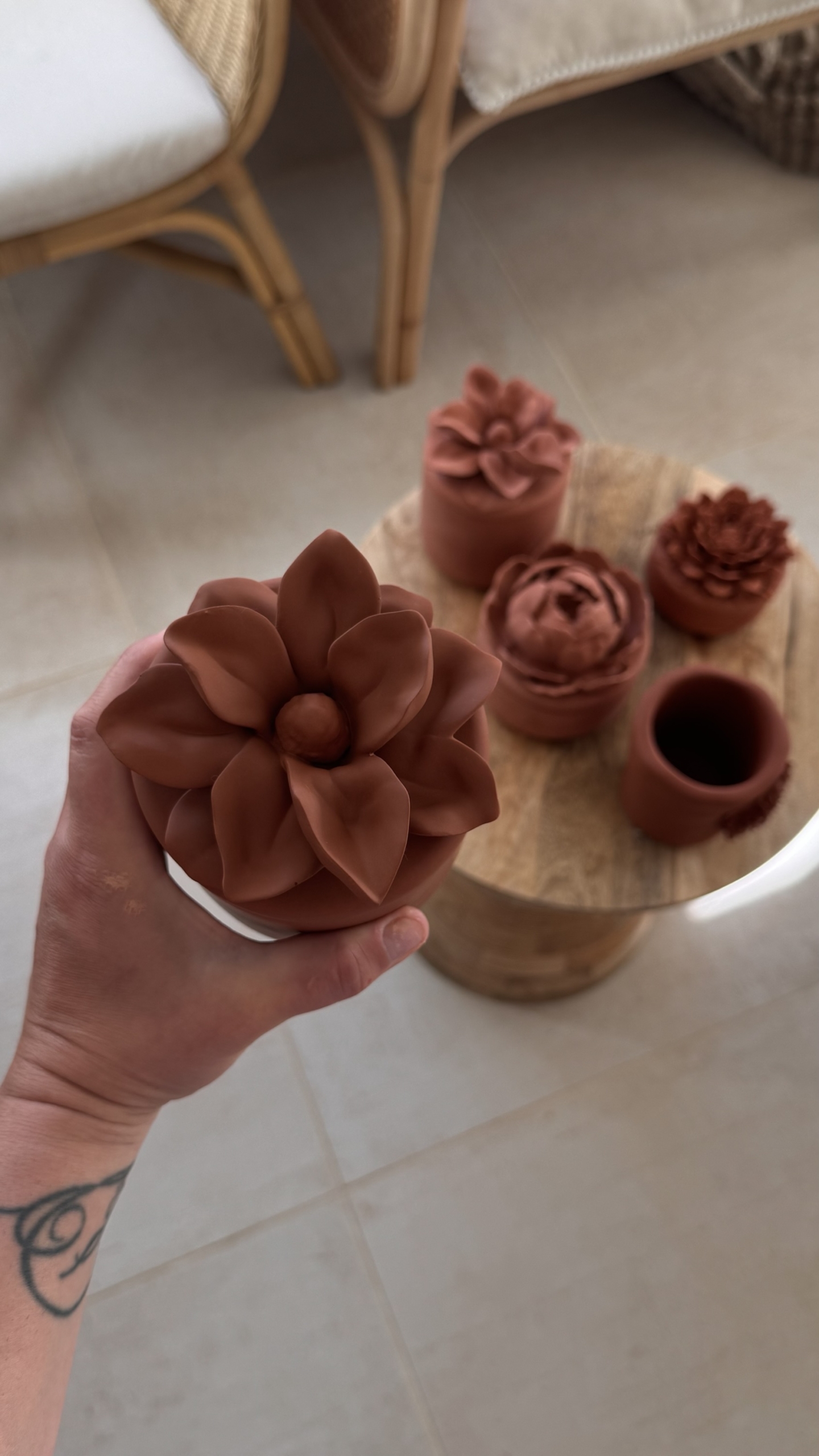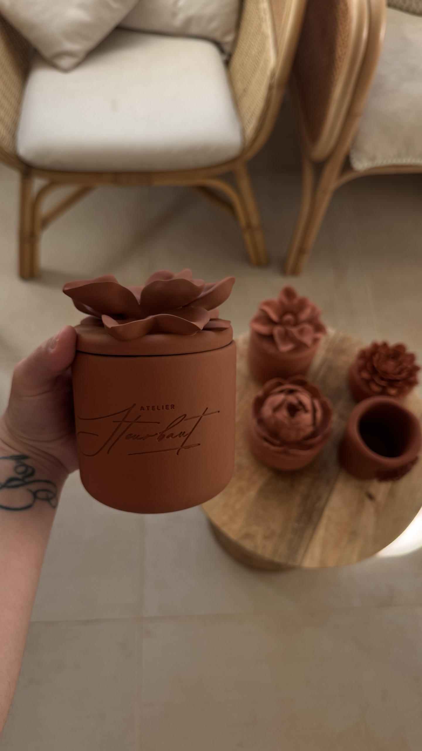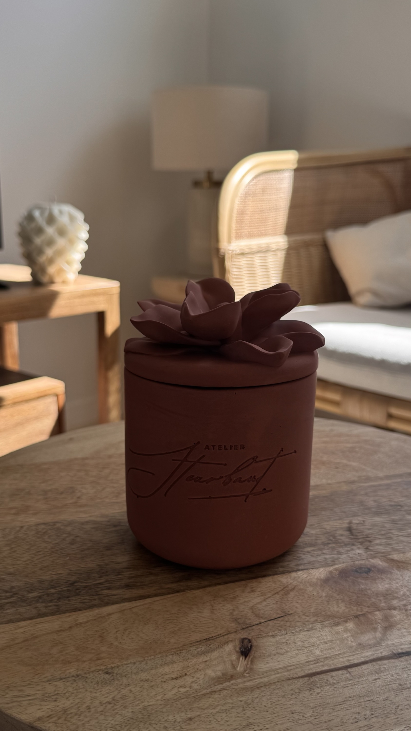 Chaque pièce est unique, avec ses nuances, son toucher minéral et son caractère singulier. Surmontées de couvercles sculptés en forme de fleurs 🌸, ces bougies deviennent de véritables pièces décoratives, pensées pour s’intégrer harmonieusement dans tous les intérieurs.