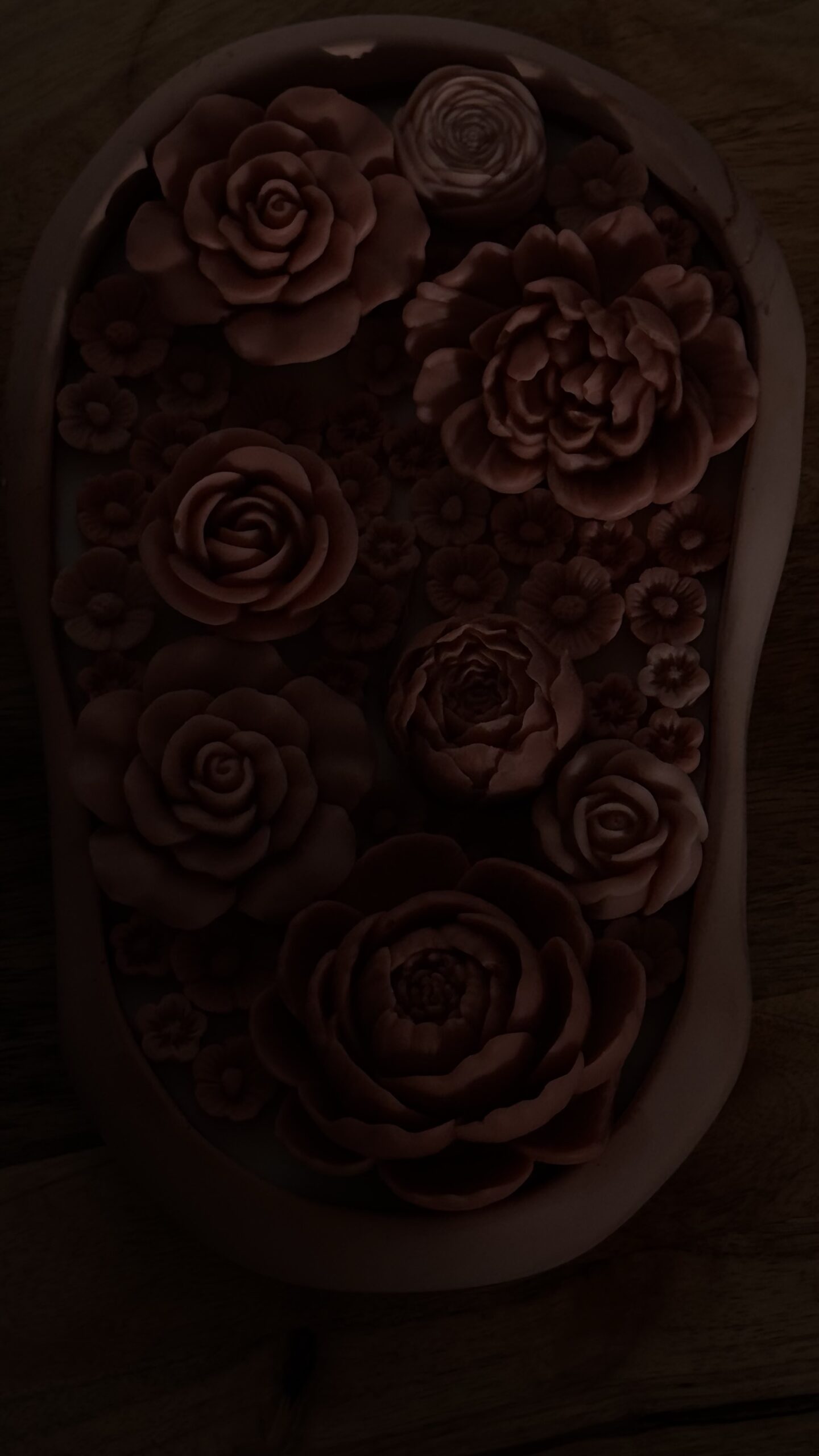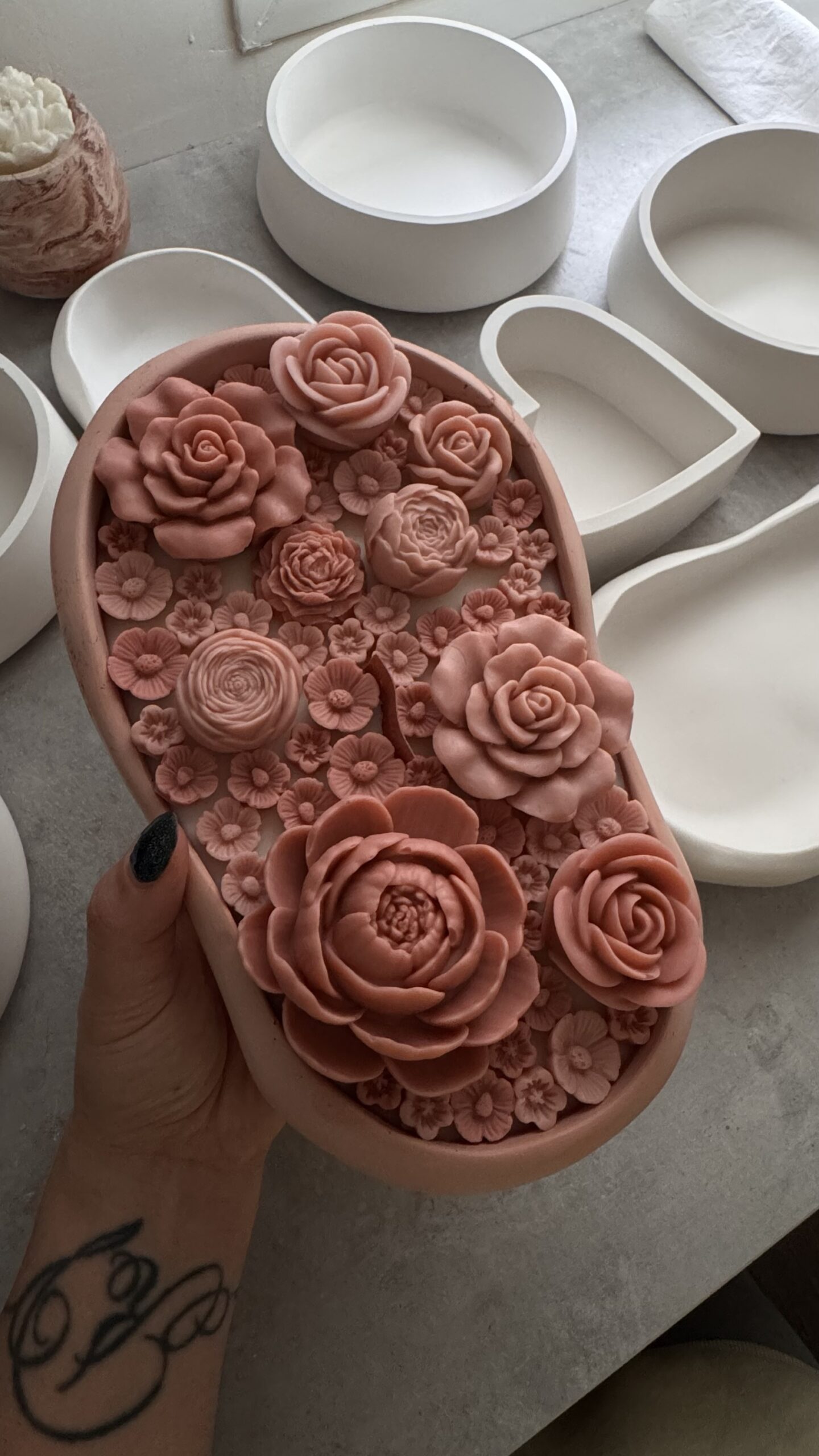 Présentée dans un nouveau contenant design en jesmonite, que je crée moi-même, cette bougie met en scène un bouquet de fleurs sculptées en cire 🌸🌺aux nuances chaudes et sublimées de fines touches dorées. Chaque fleur est minutieusement travaillée pour offrir un rendu luxueux, raffiné et profondément chaleureux.