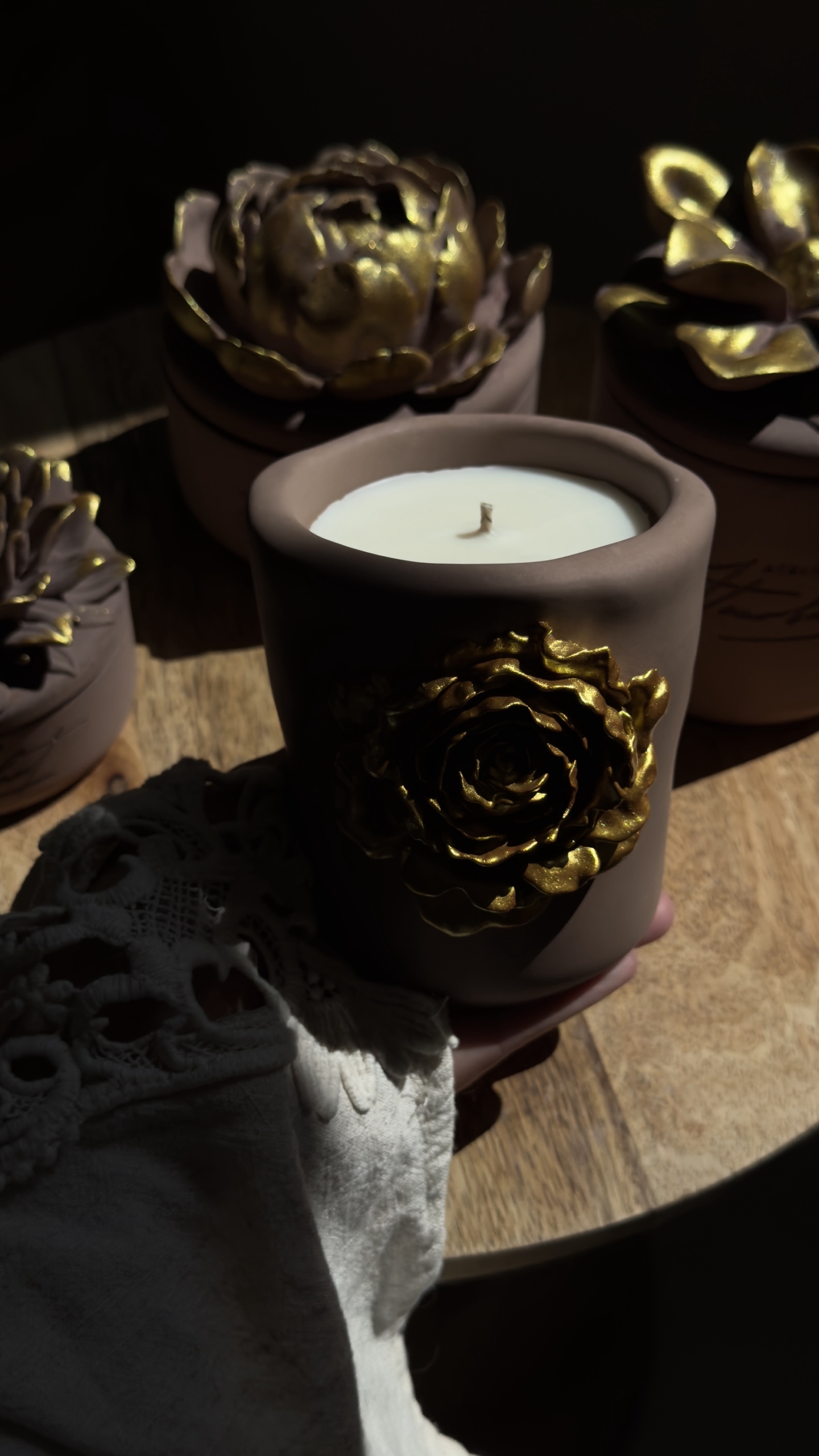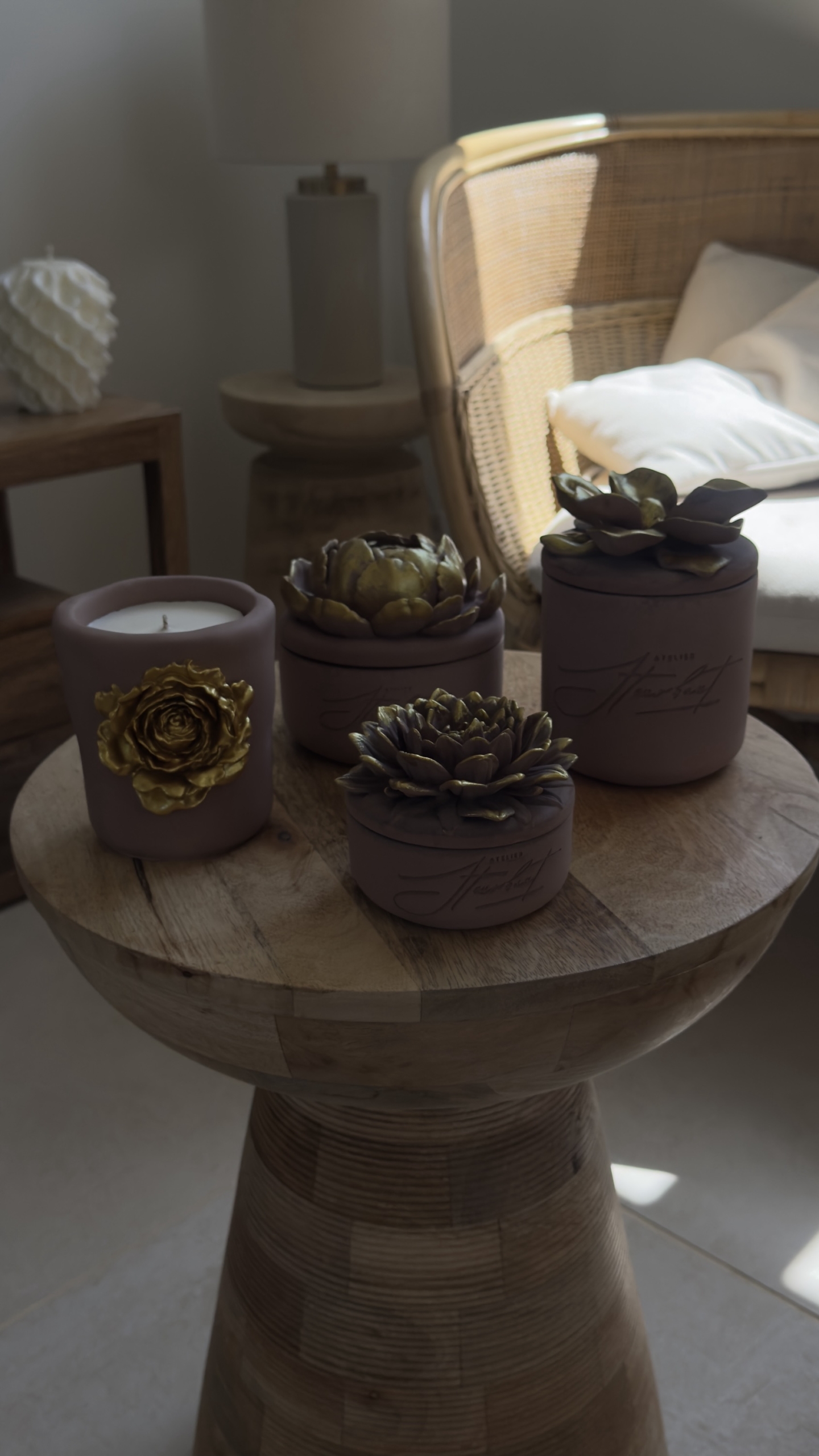 Chaque pièce est unique, avec ses nuances, son toucher minéral et son caractère singulier. Surmontées de couvercles sculptés en forme de fleurs 🌸, ces bougies deviennent de véritables pièces décoratives, pensées pour s’intégrer harmonieusement dans tous les intérieurs.