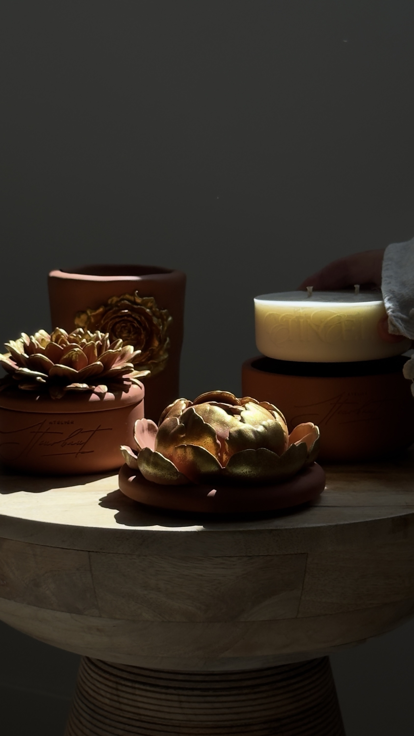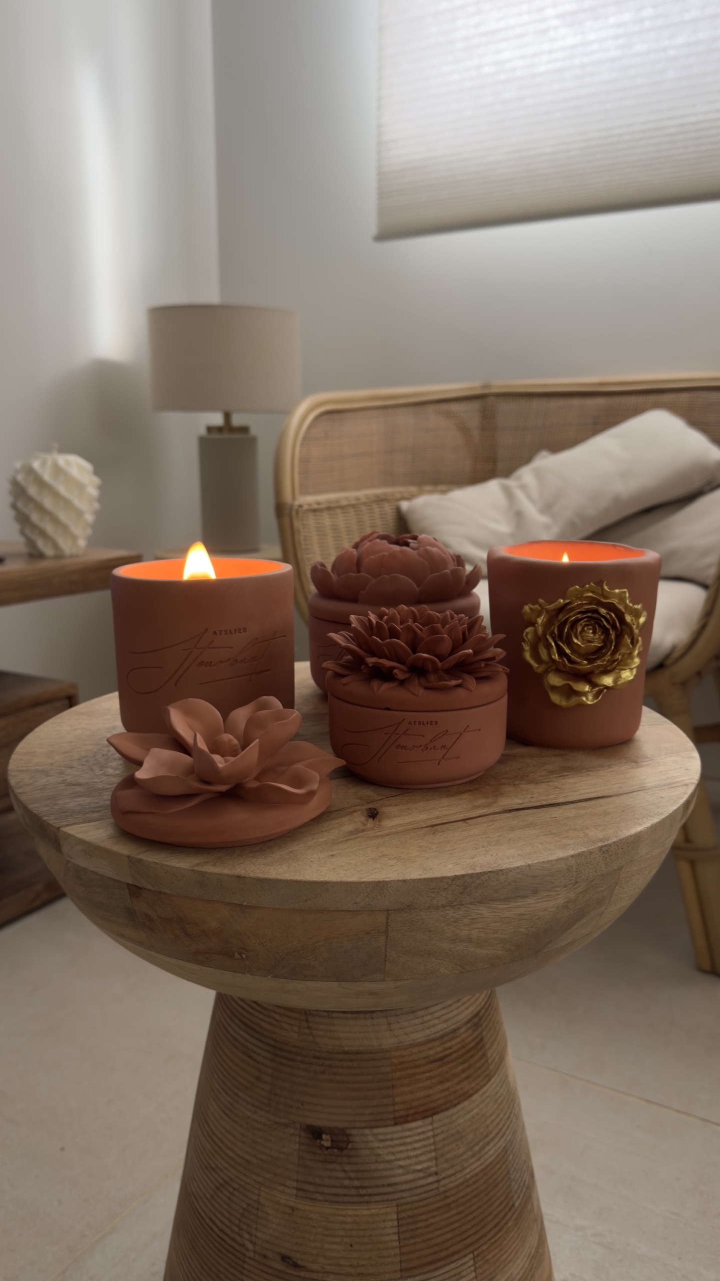 Chaque pièce est unique, avec ses nuances, son toucher minéral et son caractère singulier. Surmontées de couvercles sculptés en forme de fleurs 🌸, ces bougies deviennent de véritables pièces décoratives, pensées pour s’intégrer harmonieusement dans tous les intérieurs.