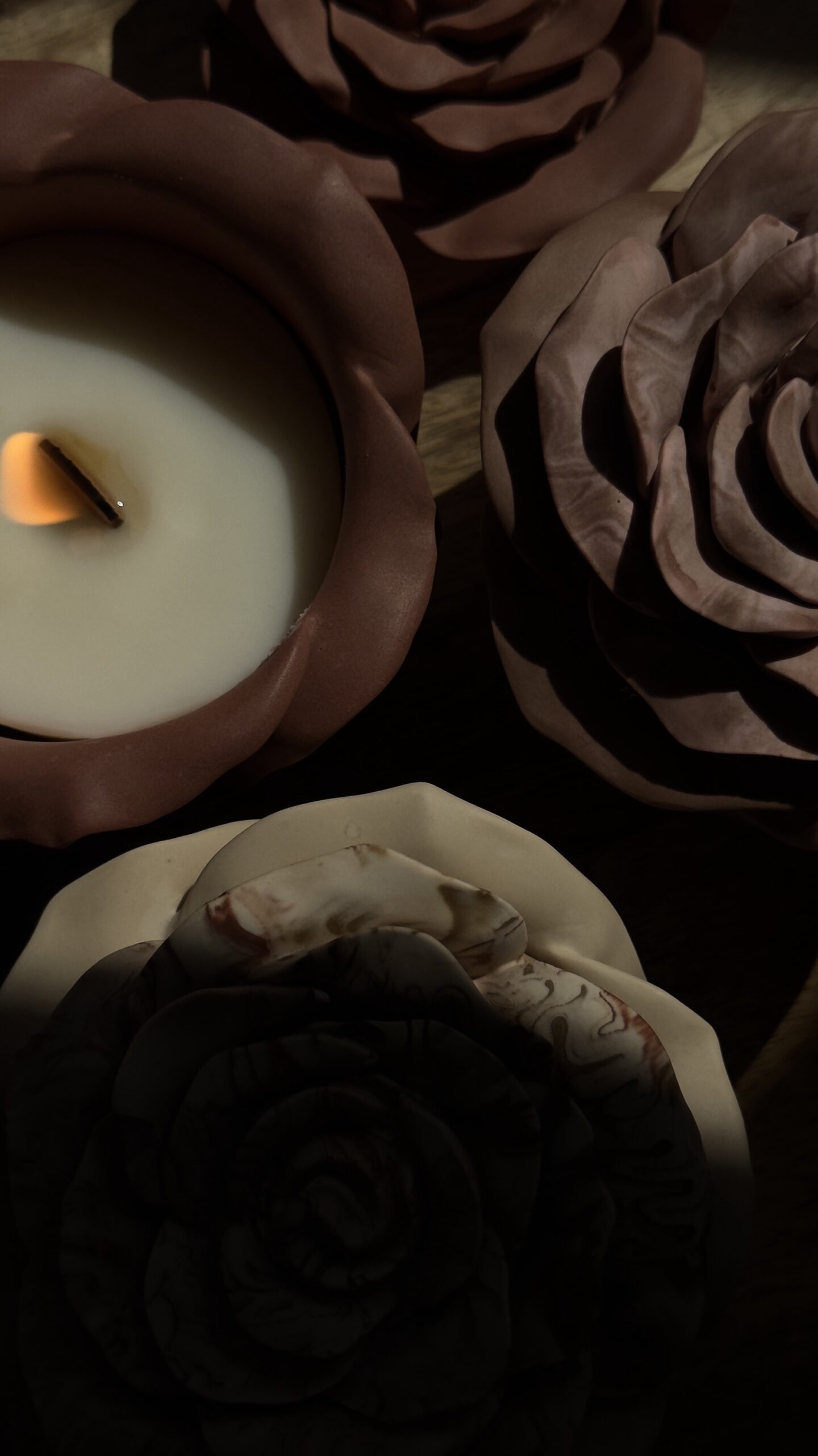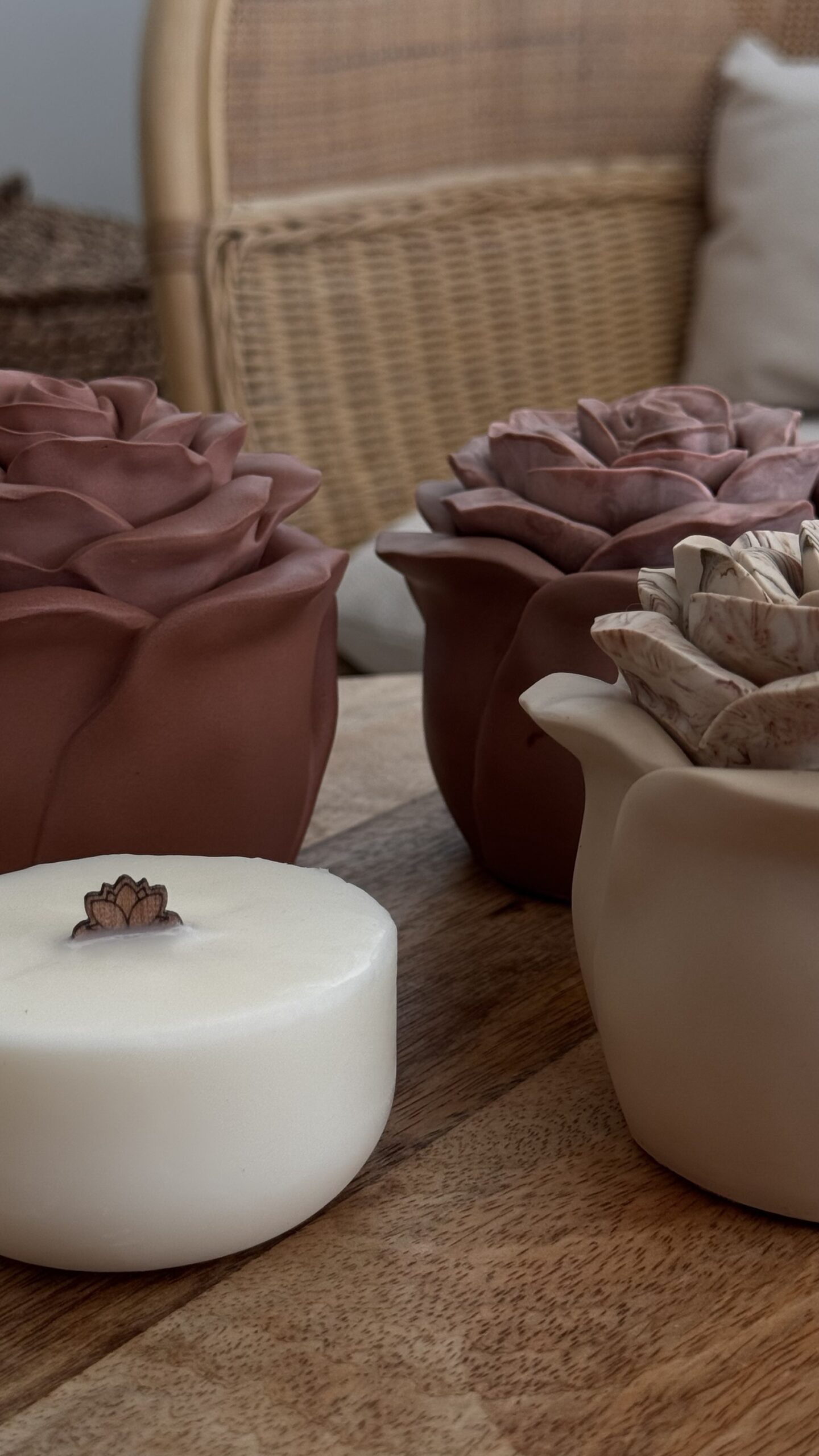 Chaque pièce est unique : je confectionne moi-même les contenants en jesmonite avec des pigments naturels. Les marbrures varient d’un modèle à l’autre, rendant votre bougie absolument exceptionnelle.