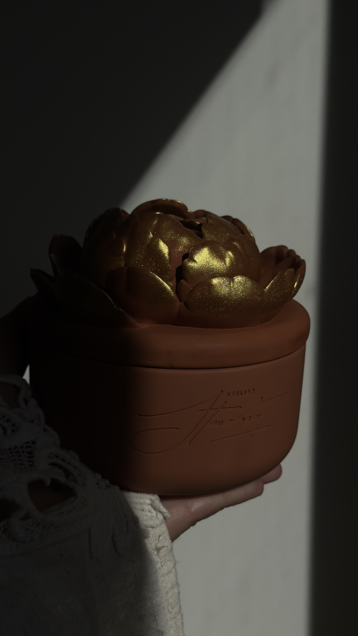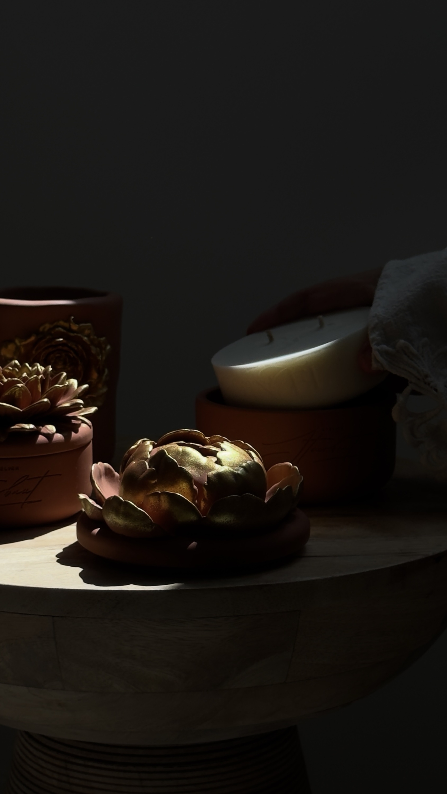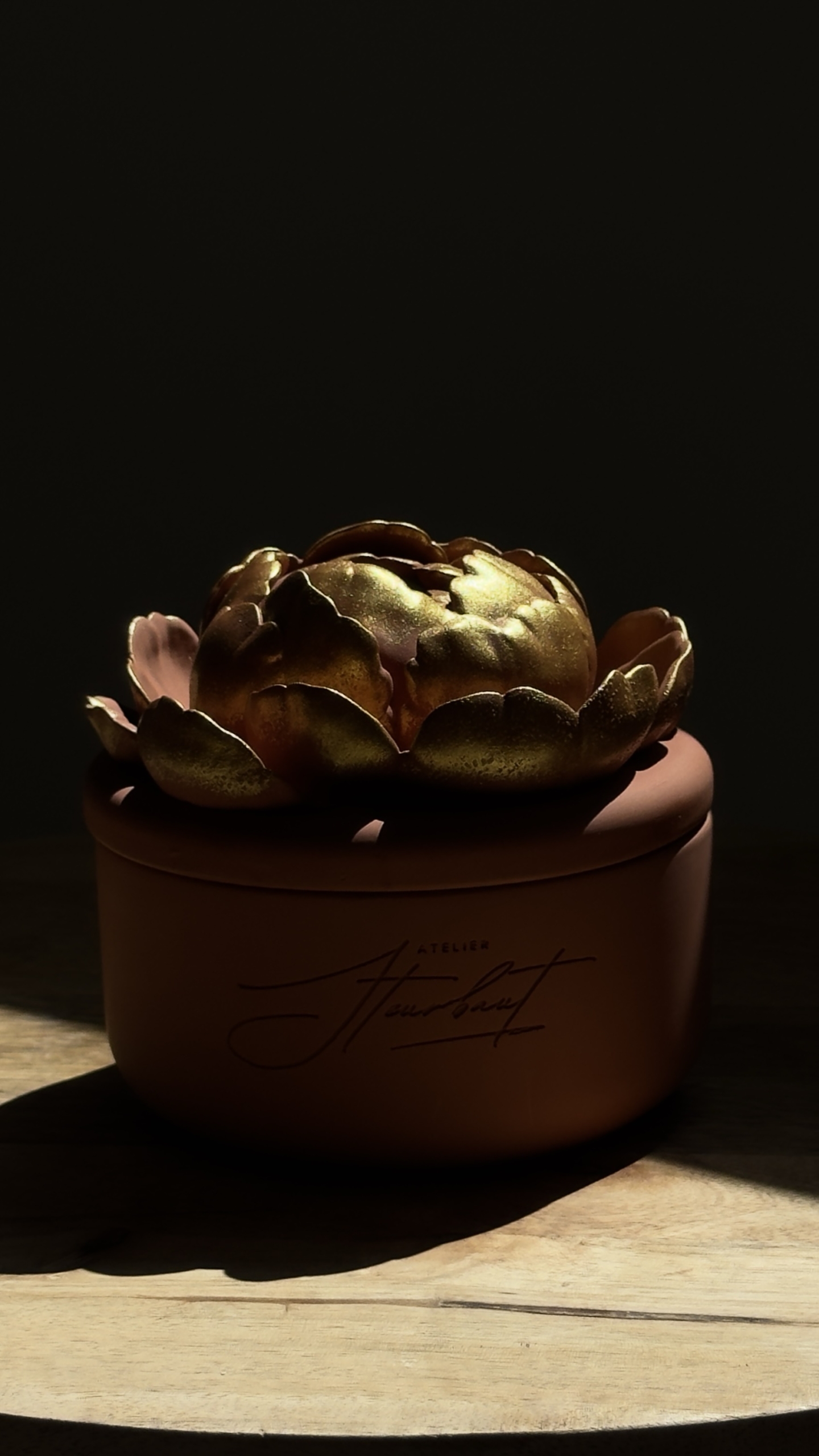 Chaque pièce est unique, avec ses nuances, son toucher minéral et son caractère singulier. Surmontées de couvercles sculptés en forme de fleurs 🌸, ces bougies deviennent de véritables pièces décoratives, pensées pour s’intégrer harmonieusement dans tous les intérieurs.